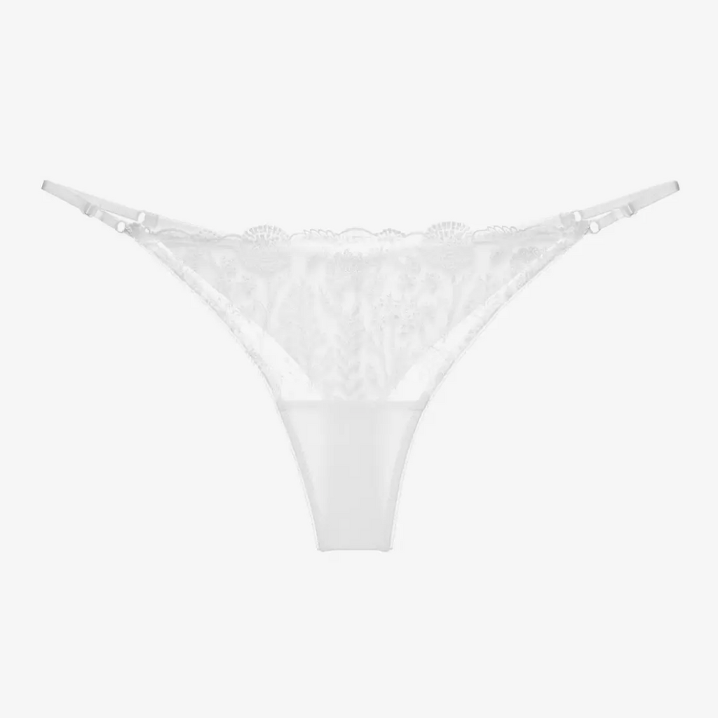 Sexy white low rise G-strings. Made of elastic fabric and mesh. The front is decorated with floral embroidery. Have a thin adjustable belt. 100% cotton gusset provides an intimate comfort. Polyamide 69%, elastane 16%, viscose 6%, polyester 1%, cotton 8%.