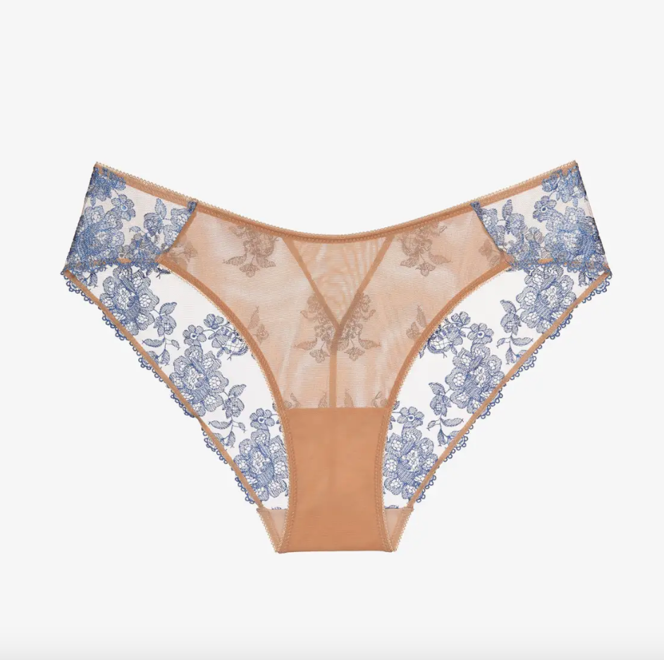 Elegant mid rise slips. Made of semitransparent beige mesh. Back is decorated with the sky blue embroidery and has an elastic triangular mesh insert. 100% cotton gusset. Polyamide 69%, elastane 16%, viscose 6%, polyester 1%, cotton 8%Hand washing: the recommended wash