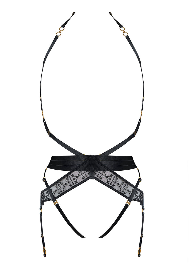 Opt for tough luxe bondage in this full body harness. Crafted from satin elastic panelling, 24k gold plated components, suspender straps and finished with satin bows to soften the look. Wear alone or layer with your favorite Bordelle pieces.
