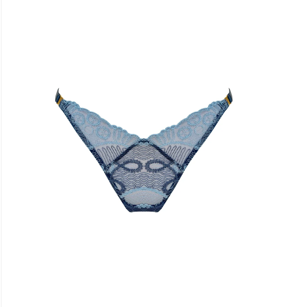 • Bordelle's Tierra Thong in Denim blue features a flattering high leg thong of delicate Bespoke embroidered tulle at the front, and comfortable mesh at the back. Satin elastic strapping adjusts via 24k gold plated components over the hip for a personalised fit.