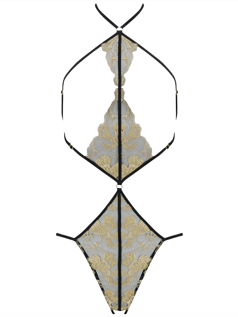 Opulent and erotic in equal measure, the Oriana Playsuit is a breathtaking ensemble of shimmering gold bespoke embroidery and ouvert splendour.