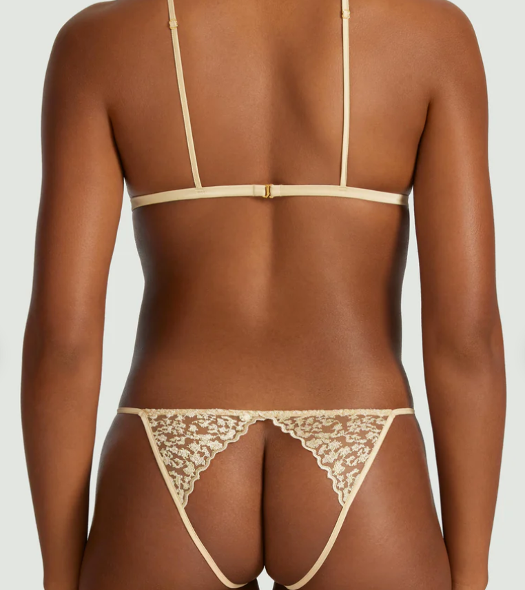 Feather embroidery wraps around the body in an hourglass silhouette. This is complemented by a delicate silk waistband which cinches the waist, moving into a silk-bound open knicker design.