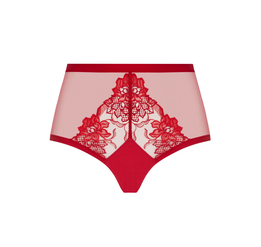 High-waisted sexy shorty structured at the waist and thighs with mesh bands. The front features multifilament embroidery with an organza flower appliqué in a pointed shape, and the sides are seamless tulle. The lower front, in a pointed shape, is made of tulle lined with cotton. The back in elastic tulle forms a triangle embellished with a coordinated embroidered motif on the front, topped with a golden chain. A side ribbon loop at the bottom allows for the addition of a thigh jewel.