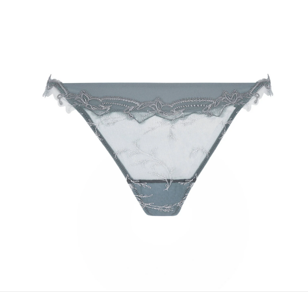 Underwear that subtly discovers the curves and ensures perfect invisibility under garments. Multi-fabric thong with scalloped Leavers lace at the thighs. The front top is made of a triangle of embroidered laize, accentuated by a V-shaped mesh band. The bottom front, pointed, is embroidered laize lined with cotton. The top back is composed of a lace triangle, enhanced by a mesh cutout. A thin chain jewel adorns the middle back waist. A ribbon attachment on the side allows for adding the thigh jewel.