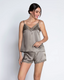 Satin silk shorts with coordinated multithreaded embroidery inlaid on the front thigh bottom and small slits on the sides. Smooth front waistband and elastic back for added comfort.