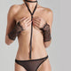 Fall for the sexy Accroche Coeur combination, which includes a brazilian and a harness: two ultimate seductive pieces! Transparency is a theme in the Brazilian's work. The front of these underwear is covered in a delicate and light mesh. The back is covered in a beautiful lace with graphic accents. The harness that comes with the thong runs between the breasts, wraps around the neck, and creates a sensational necklace look. The harness is adjustable and closes at the nape of the neck with staples, leaving the back entirely exposed. The brazilian from the Accroche Cur range can be worn with or without the harness, depending on your preferences.